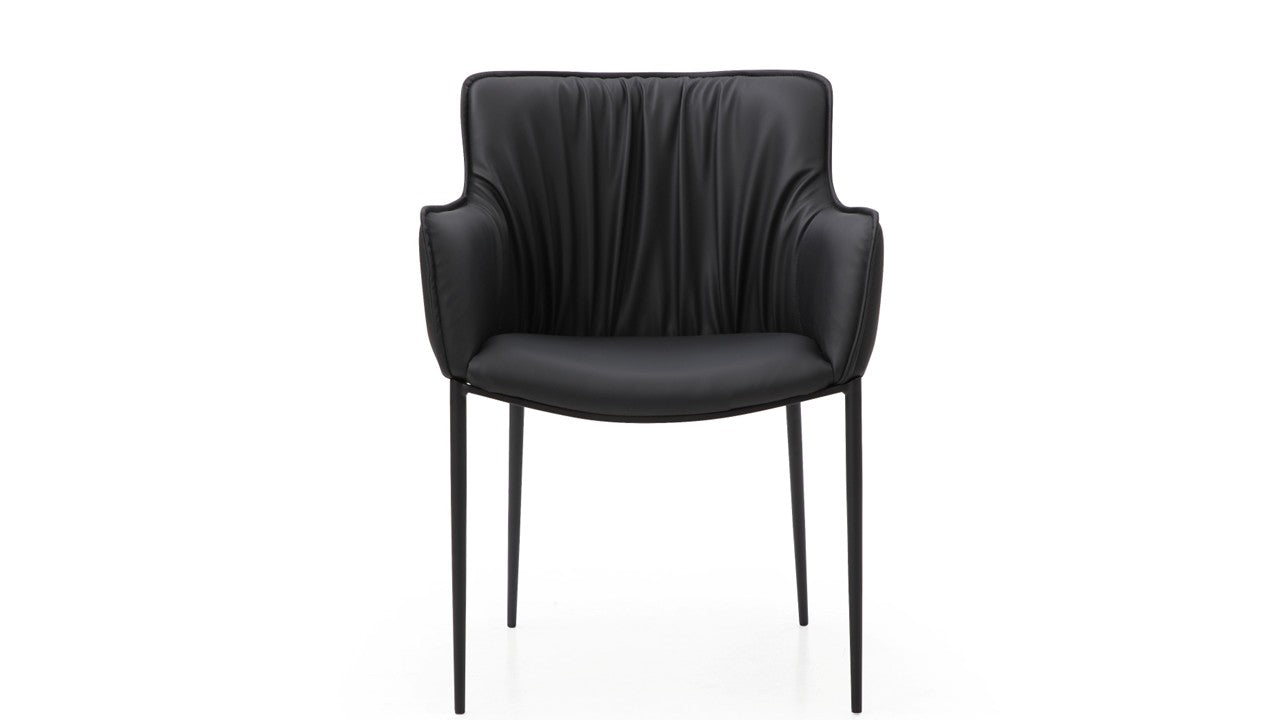 Tiffany dining armchair with sleek lines and refined design, expresses its sophisticated elegance through its imposing presence. Available in Black or Brown Faux Leather,Black Powder-Coated Steel Legs.